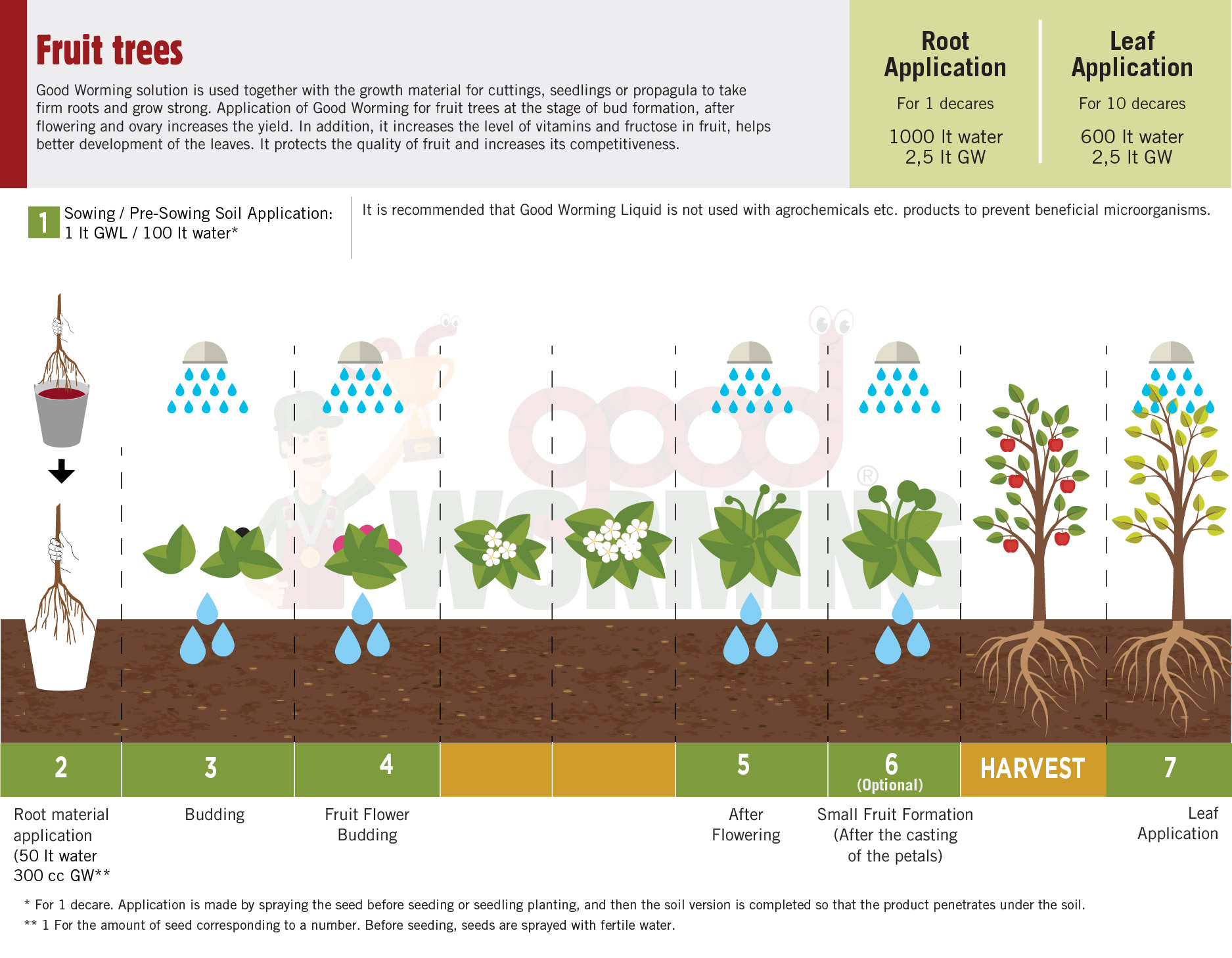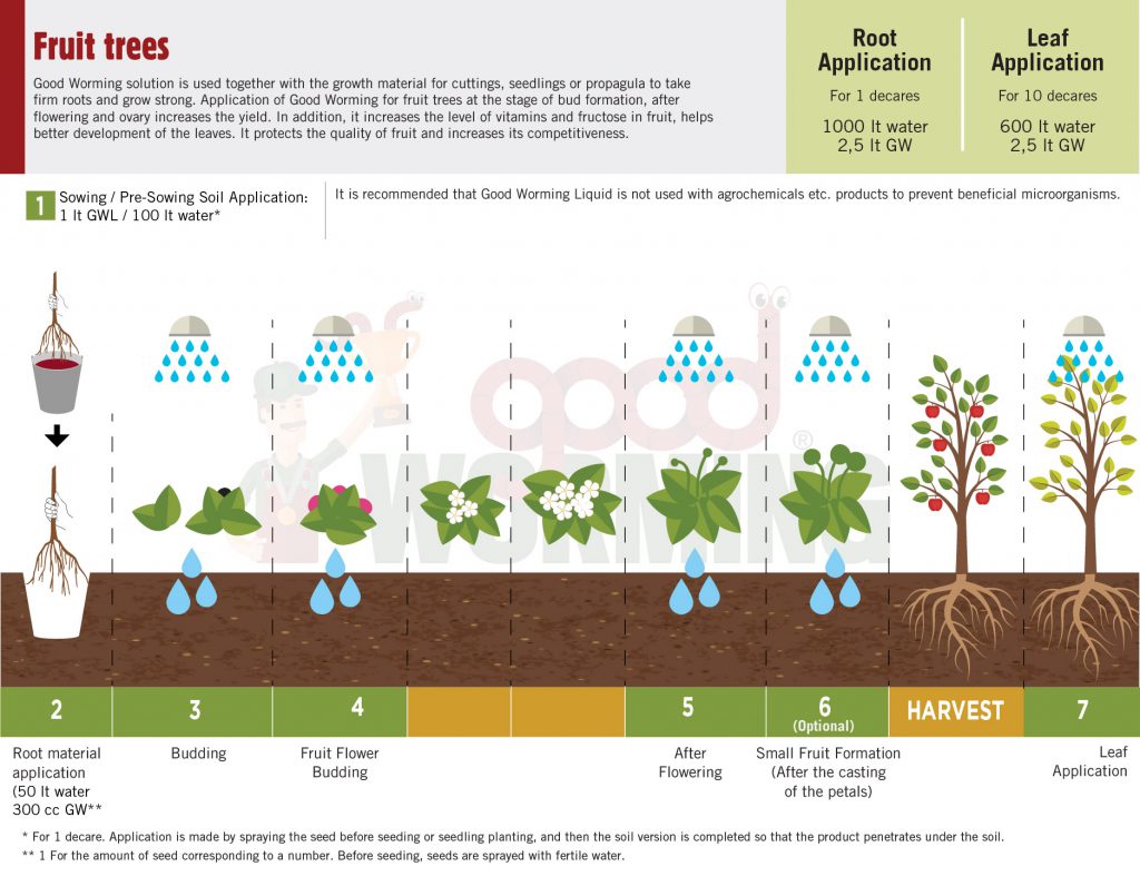 Good Worming solution is used together with the growth material for cuttings, seedlings or propagula to take firm roots and grow strong. Application of Good Worming for fruit trees at the stage of bud formation, after flowering and ovary increases the yield. In addition, it increases the level of vitamins and fructose in fruit, helps better development of the leaves. It protects the quality of fruit and increases its competitiveness.