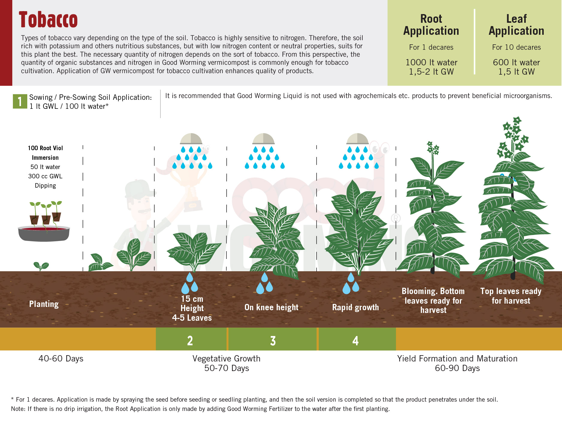 Types of tobacco vary depending on the type of the soil. Tobacco is highly sensitive to nitrogen. Therefore, the soil rich with potassium and others nutritious substances, but with low nitrogen content or neutral properties, suits for this plant the best. The necessary quantity of nitrogen depends on the sort of tobacco. From this perspective, the quantity of organic substances and nitrogen in Good Worming vermicompost is commonly enough for tobacco cultivation. Application of GW vermicompost for tobacco cultivation enhances quality of products.
